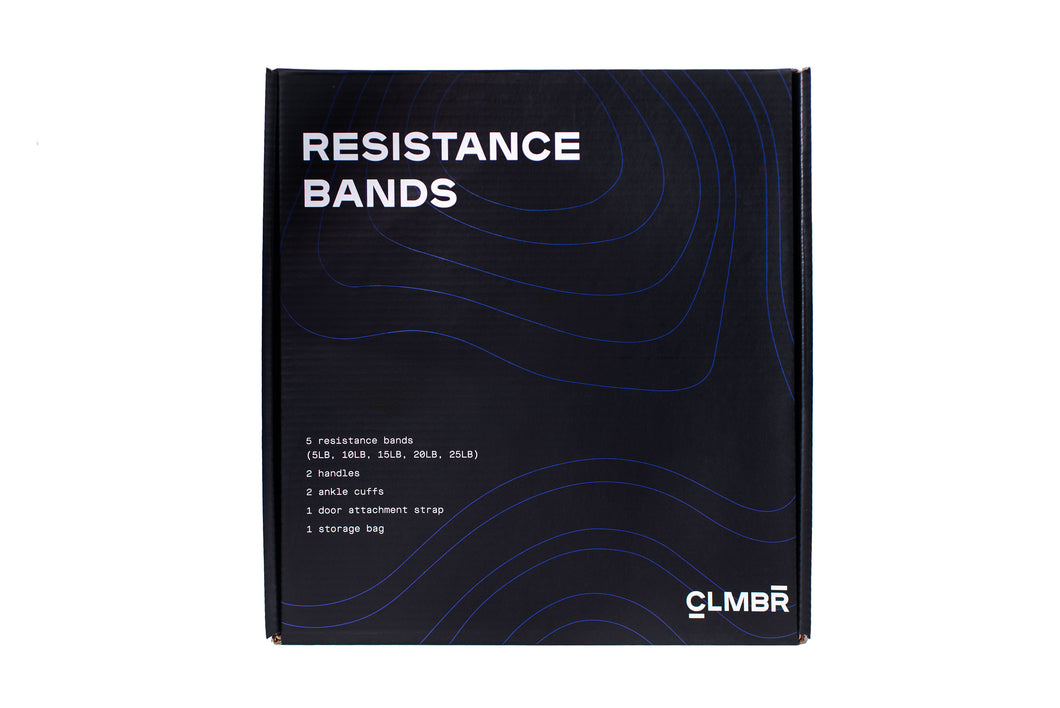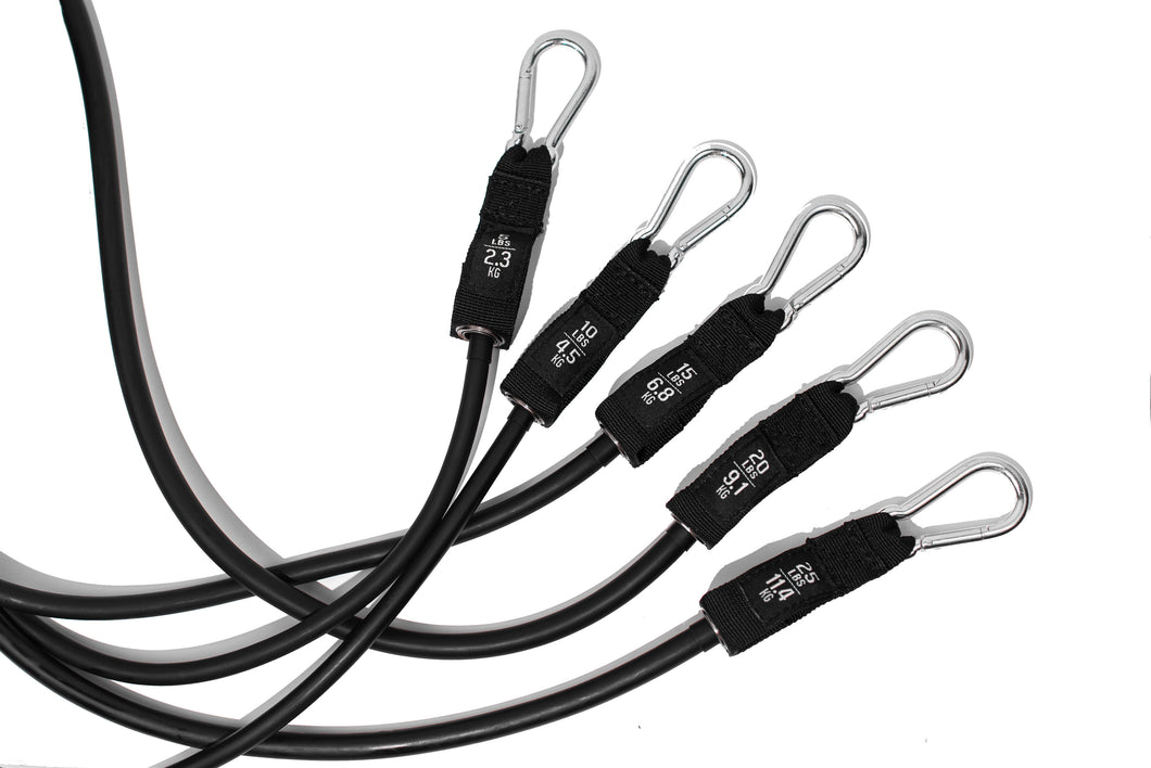 - 5 resistance bands (5lbs, 10lbs, 15lbs, 20lbs, 25lbs)